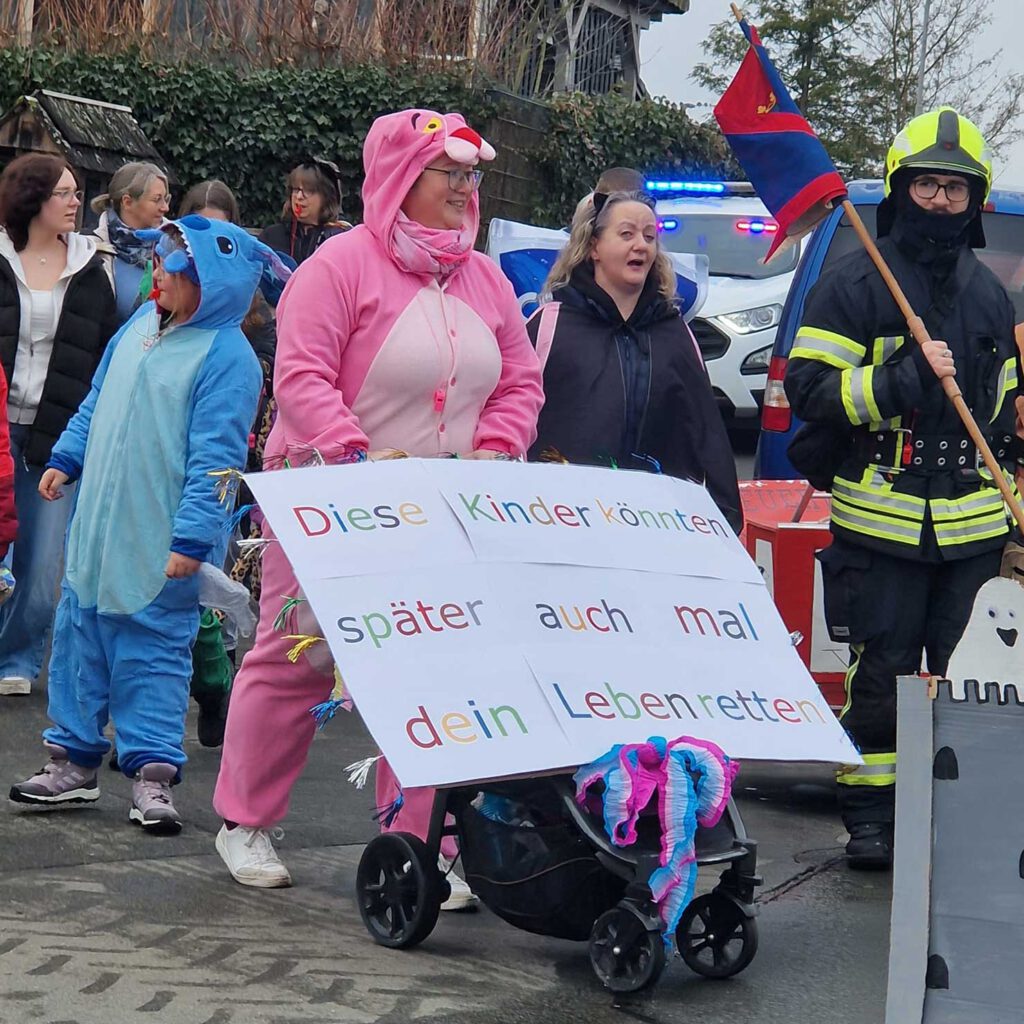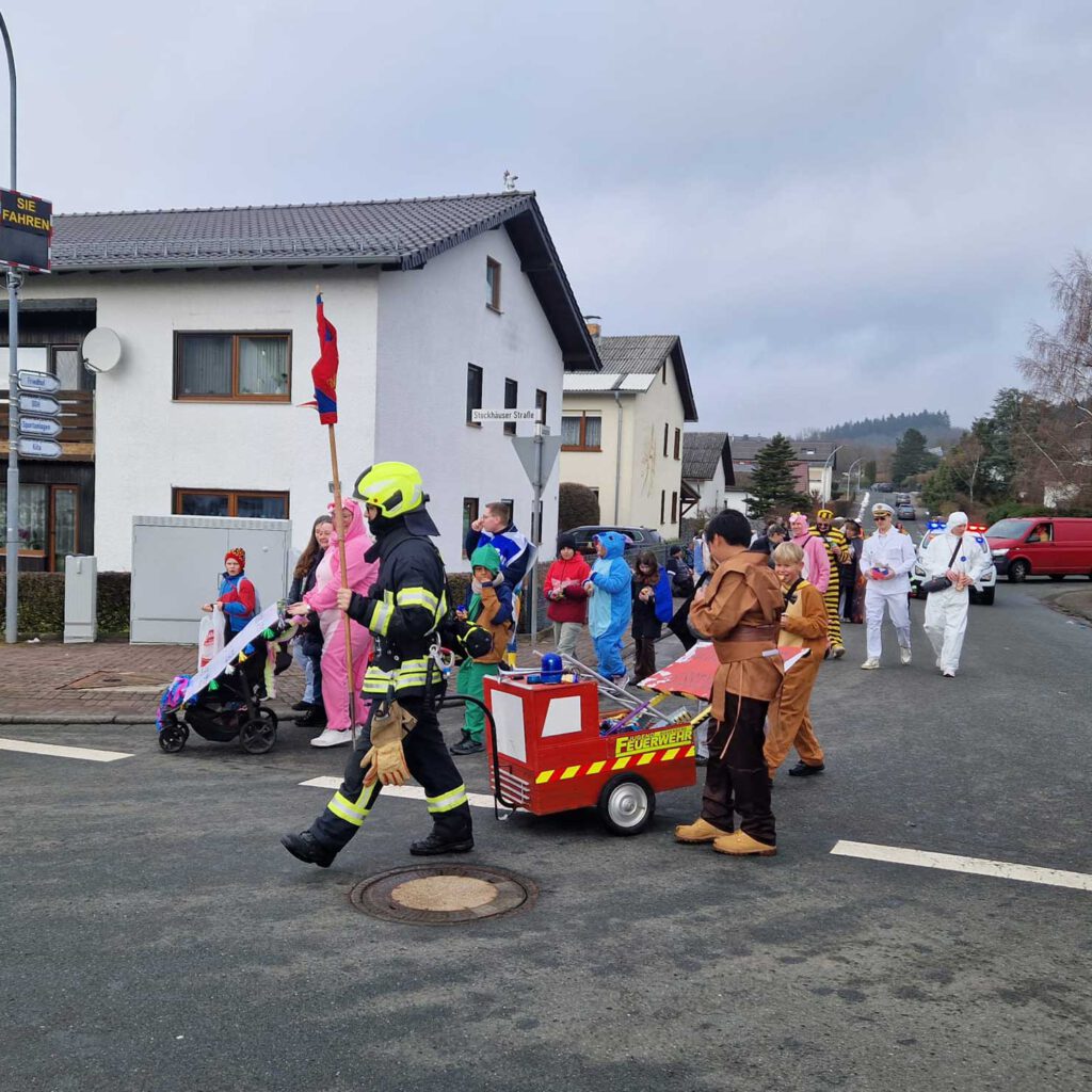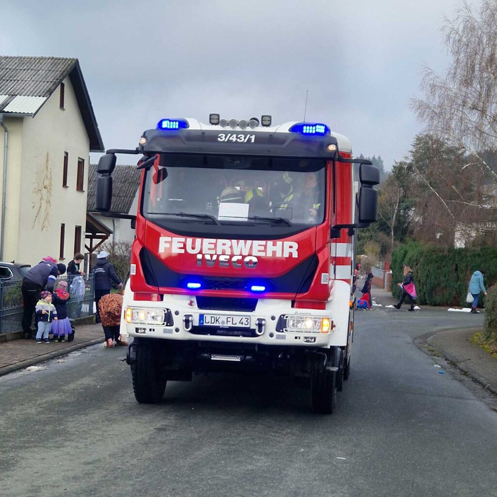 Am Samstag begleitete die Feuerwehr der Stadt Leun den traditionellen Faschingsumzug im Stadtteil Bissenberg und sorgte dabei für die notwendige Sicherheit entlang der Strecke.