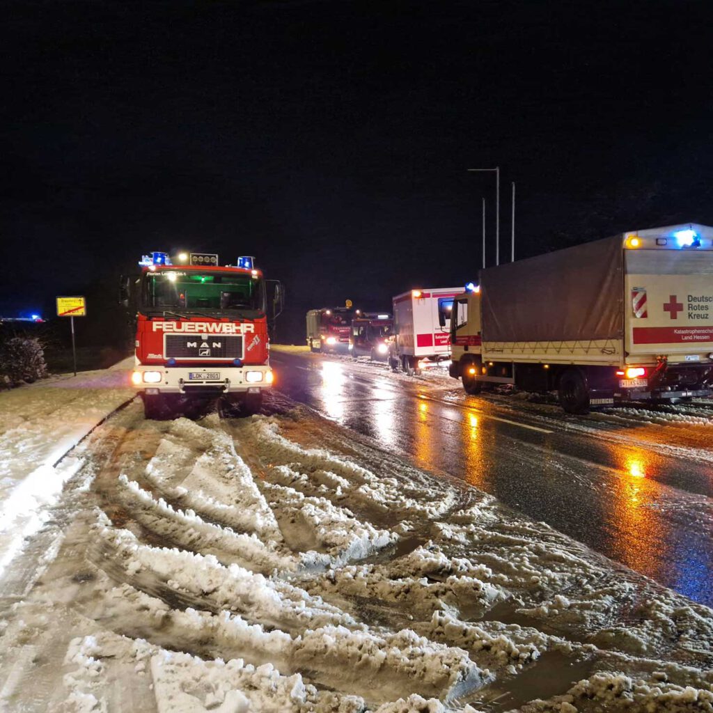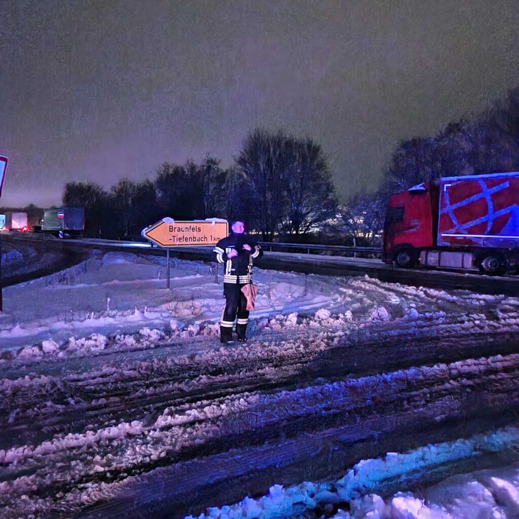 Am Dienstagabend forderte die anhaltende Extremwetterlage auch die Feuerwehr der Stadt Leun. Gegen 17:50 Uhr wurden die Einsatzkräfte alarmiert, um die Staulage auf der Bundesstraße 49 in Fahrtrichtung Limburg zu erkunden. Bereits seit etwa 15 Uhr stand dort der Verkehr still – insbesondere festgefahrene LKW im Bereich Weilburg blockierten die Weiterfahrt vollständig. Laut Polizei sollte die Bergung der Fahrzeuge noch mehrere Stunden dauern.